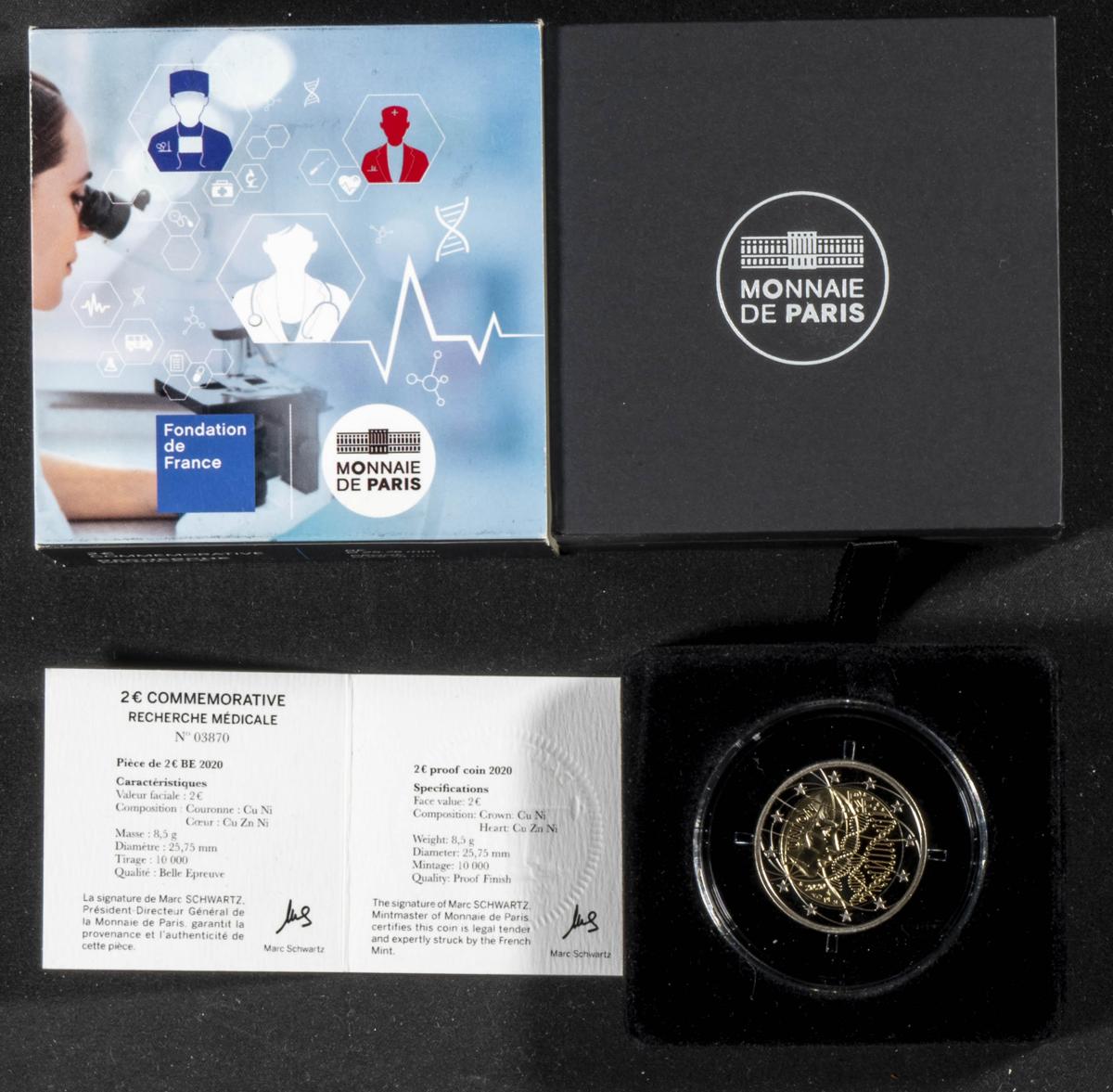 FRANCIA. Moneda conmemorativa de 2 Euros del año 2020. Investigación Médica. Monnaie de París. Presentada en estuche oficial con certificado de autenticidad. Calidad BE (Belle Epreuve). Tirada de 10 mil ejemplares.