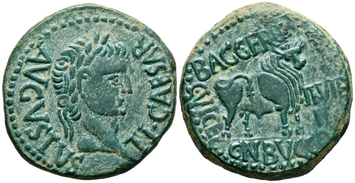 CELSE (Velilla del Ebro, Zaragoza). As. (Ae. 13,67g/28mm). 14-36 d.C. (FAB-819). Anv: Cabeza laureada de Tiberio a derecha, alrededor leyenda: TI CAESAR AVGVSTVS. Rev: Toro a derecha, encima leyenda: BACC FRONT, debajo: CN BVCCO, a la izquierda: D V I CEL, a la derecha: II VIR II. MBC+.