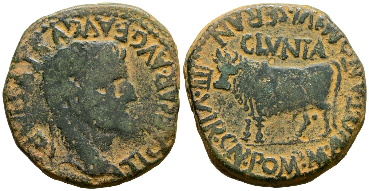 CLUNIA (Coruña del Conde, Burgos). As. (Ae. 11,09g/27mm). 37-41 d.C. (FAB-836). Anv: Cabeza laureada de Tiberio a derecha, alrededor leyenda: TI CAESAR AVG F AVGVSTVS IMP. Rev: Toro a izquierda, encima leyenda: CLVNIA, alrededor leyenda: CN POMP M ANTO T ANTO M IVL SERAN III VIR. MBC-.