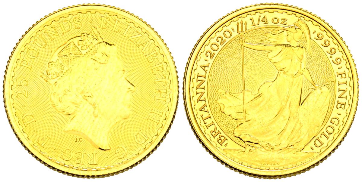 GRAN BRETAÑA. 1/4 de Onza (Au. 7,82g/22mm). 2020. Isabel II. Serie Britannia. Oro de 0,999 milésimas. SC-.