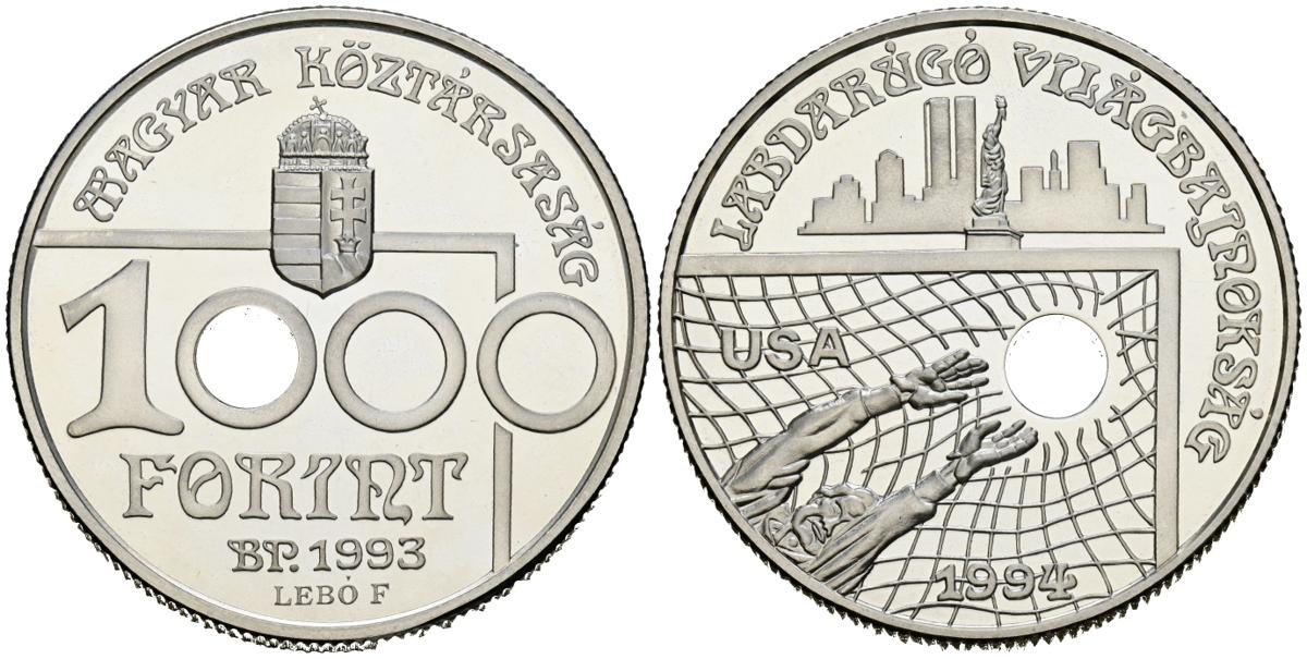 HUNGRIA. 1000 Forint. (Ar. 31,52g/39mm). 1993. Mundial de Fútbol USA´94. (Km#706). PROOF. 15 mil piezas acuñadas.