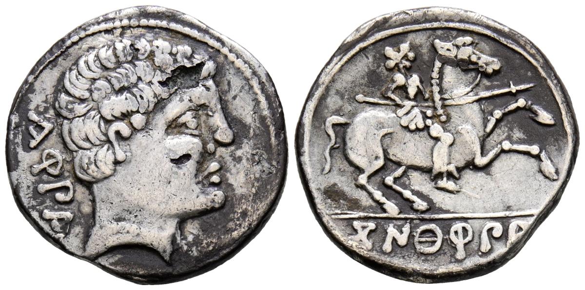 CONTERBIA CARBICA (Huete, Cuenca). Denario. (Ar. 2,90g/18mm). 120-80 a.C. (FAB-845). Anv: Cabeza masculina a derecha, detrás leyenda: CaRBICA. Rev: Jinete con lanza a derecha, debajo leyenda ibérica bajo leyenda: CoNTERBiA. MBC. Oxidaciones limpiadas. Escaso ejemplar.