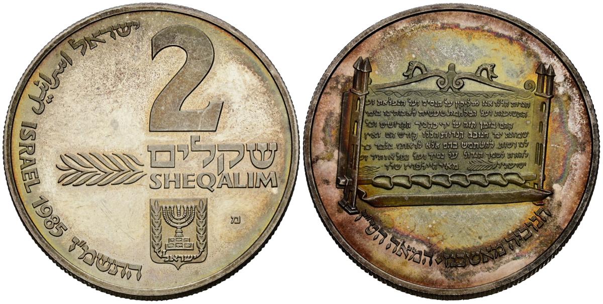 ISRAEL. 2 Sheqalim (Ar. 28,99g/37mm). 1985. Hanukka. Lámpara Ashkenaz. (Km#162). PROOF. Pátina. Escasa