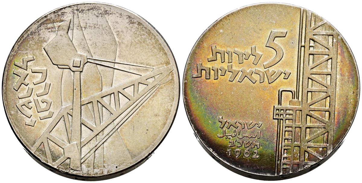 ISRAEL. 5 Lirot. (Ar. 25,02g/34mm). 1962. 14 Aniversario de la Independencia. Marca de ceca en el anverso. (Km#35). EBC+. Pátina. Escasa.
