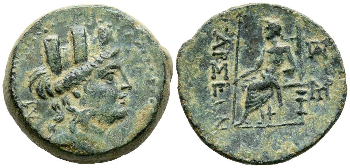 CILICA, Tarsos. Ae22. (Ae. 7,34g/22mm). 164-27 a.C. (SNG France 128-94). Anv: Cabeza de Tyche con torreta a derecha. Rev: Zeus sentado a izquierda portando cetro, delante leyenda griega, detrás dos monogramas griegos. MBC.