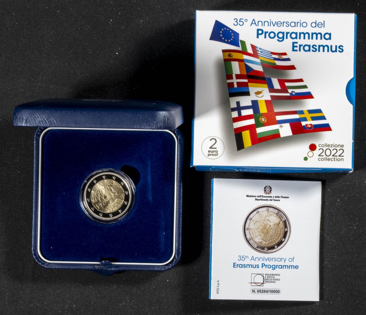 ITALIA. Moneda conmemorativa de 2 Euros del año 2022. 35 Aniversario del Programa Erasmus. Presentada en estuche oficial con certificado de autenticidad. Calidad PROOF. Tirada de 10 mil ejemplares.