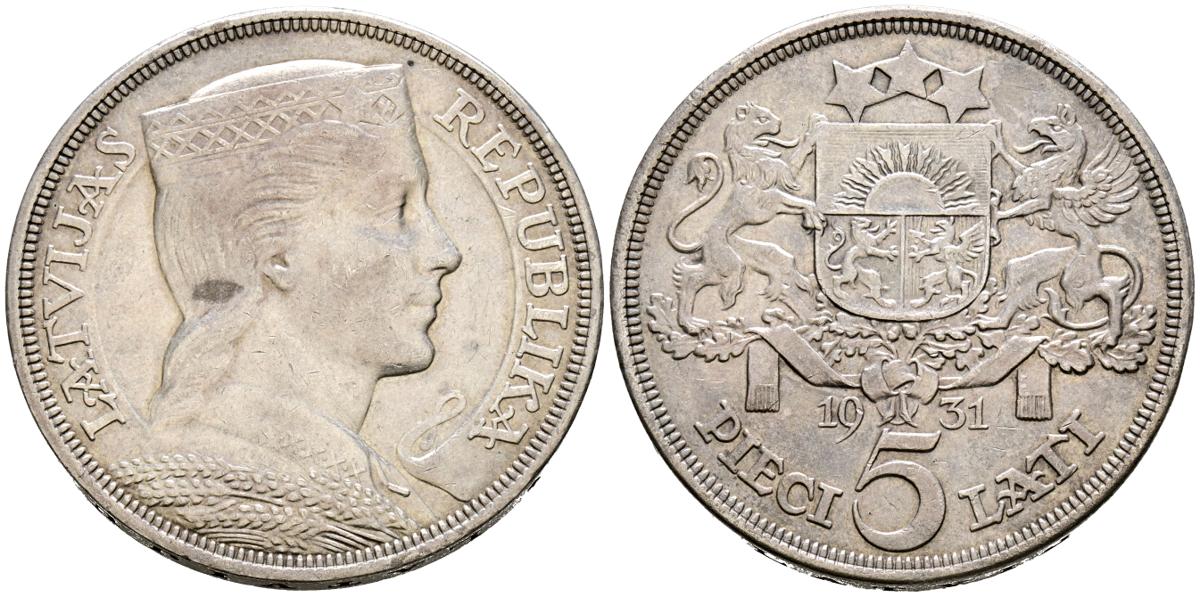 LETONIA. 5 Lati. (Ar. 25,02g /37mm). 1931. Primera República (1918-1940). (Km#9). MBC+. Bonito tono.