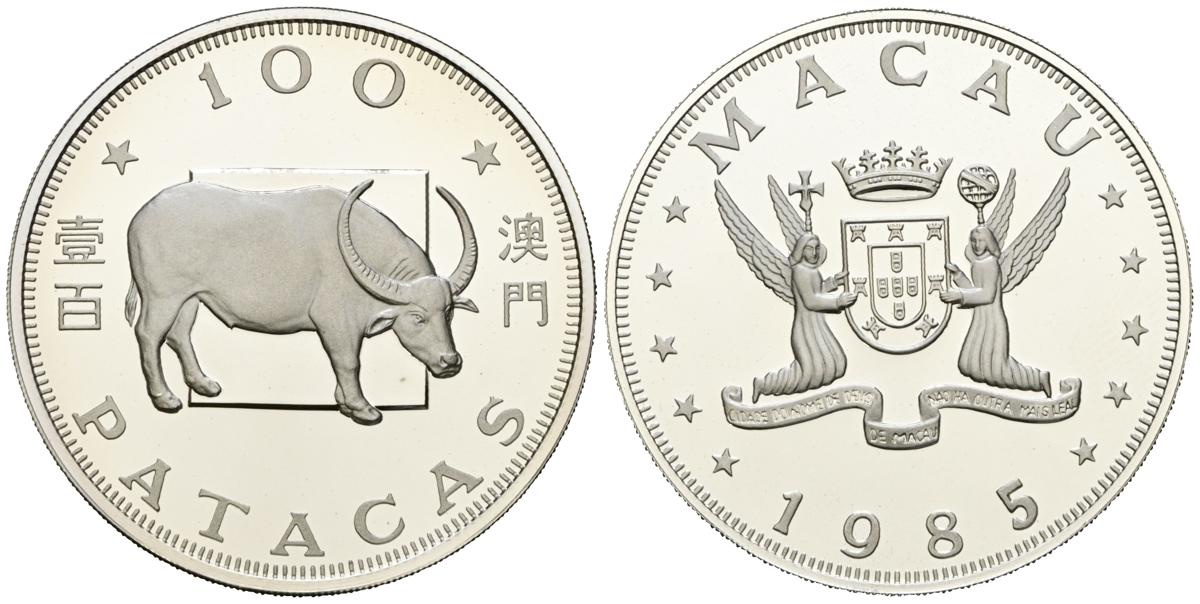 MACAO. 100 Patacas (Ar. 28,01g/38mm). 1985 (Provincia Portuguesa de Ultramar). Zodiaco Chino: Año del Buey. (Km#31). PROOF. Escasa.