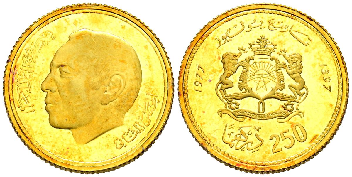 MARRUECOS. 250 Dirhams. (Au. 6,55g/21mm). 1977. Aniversario nacimiento del Rey Hassan II (9 Julio 1977). (Km#Y66). PROOF.