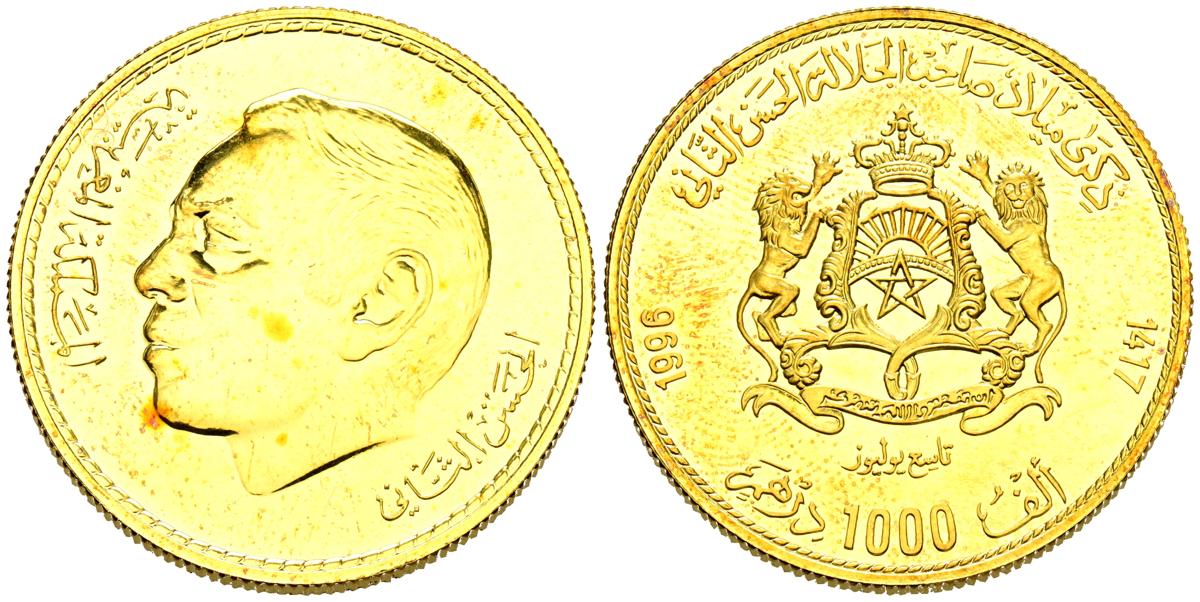 MARRUECOS. 1000 Dirhams. (Au. 21,58g/31mm). 1996. Aniversario nacimiento del Rey Hassan II (9 Julio 1996). (Km#Y134). SC.