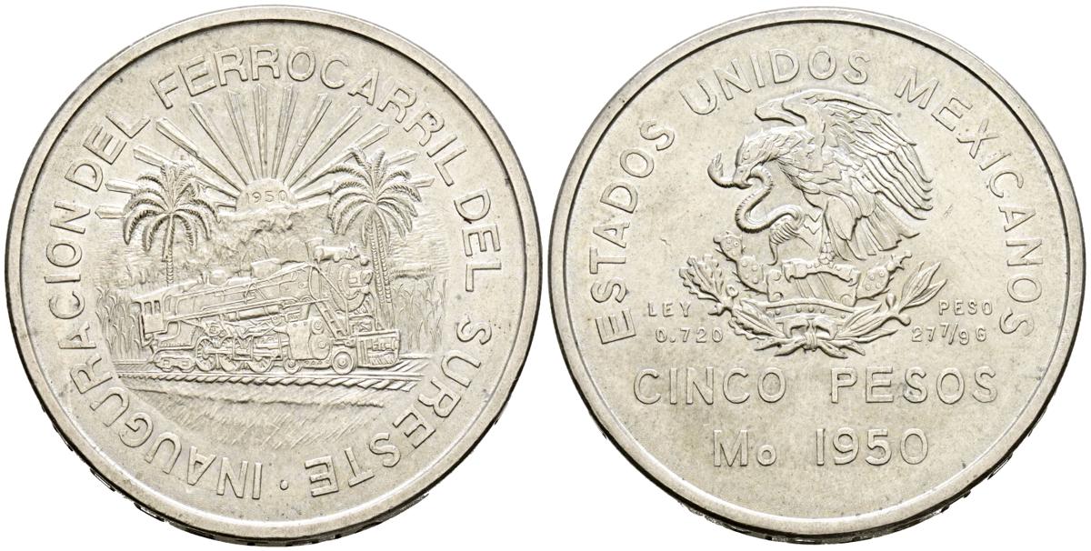 MÉXICO. 5 Pesos (Ar. 27,83g/45mm). 1950. Inauguración del Ferrocarril del Sureste. (Km#466). MBC+. Escasa.