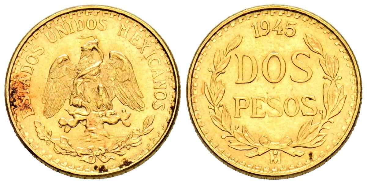MÉXICO. 2 Pesos. (Au. 1,66g/12mm). 1945. Reacuñación oficial. (Km# 461). EBC+.