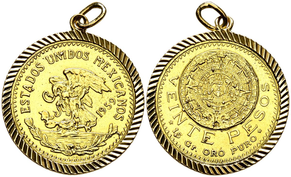 MÉXICO. 20 Pesos (Au. 6,93g/30mm). 1959. Reproducción de joyería. Oro de 0,750 milesimas. MBC-. Engarzada