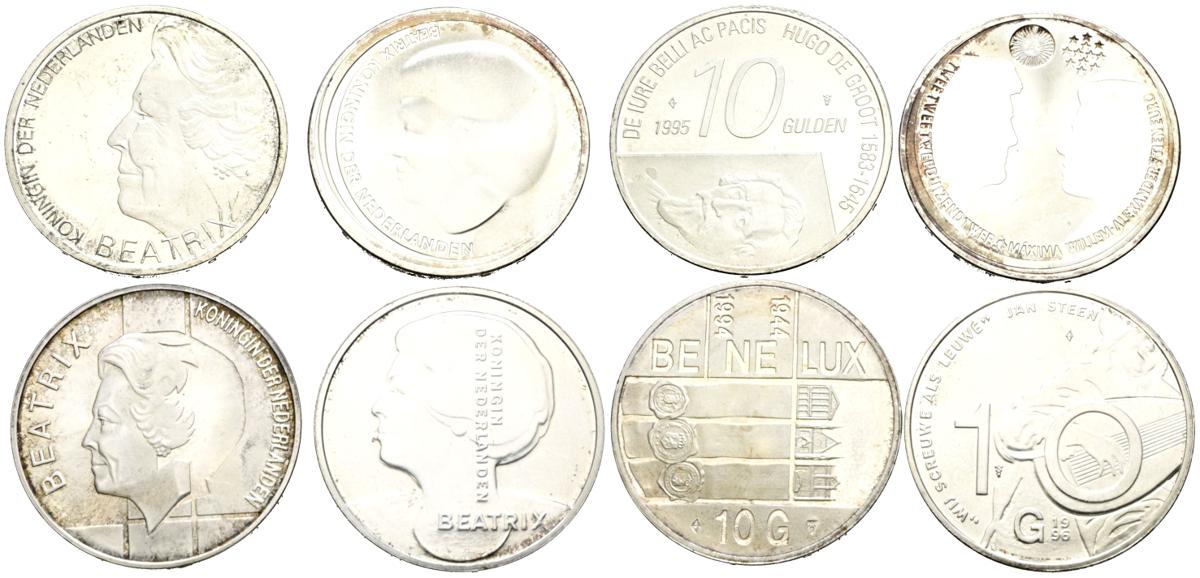 PAÍSES BAJOS. Interesante conjunto de 4 monedas de plata con valor de 10 Gulden acuñados en 1994, 1995, 1996 y 1998. Alto nivel de conservación general. A EXAMINAR.