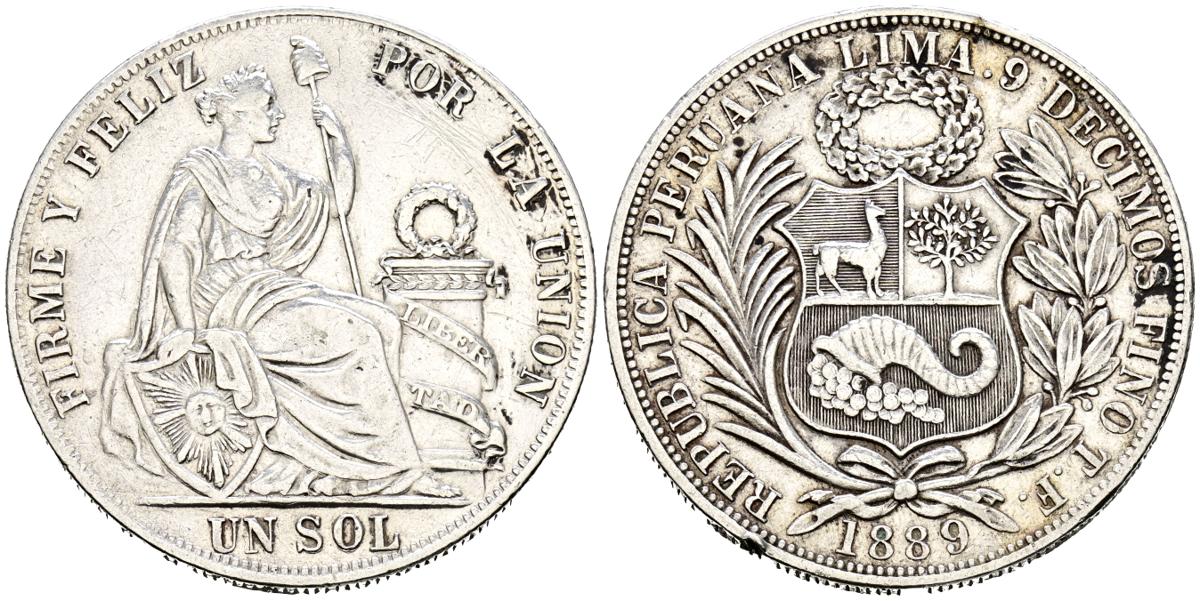 PERÚ. 1 Sol. (Ar. 24,83g/37mm). 1889. Lima TF. (Km#196). MBC-.
