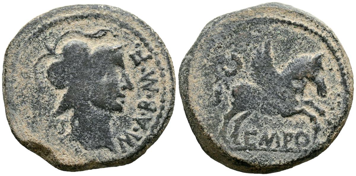 EMPORITON (Ampurias, Gerona). As. (Ae. 12,27g/28mm). 50-27 a.C. (FAB-1262). Anv: Cabeza de Palas con casco a derecha, delante leyenda: M A B M F M. Rev: Pegaso a derecha, encima corona de laurel, debajo leyenda: EMPOR. MBC-.