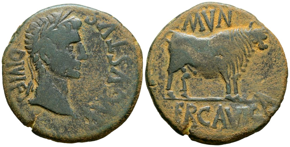ERCAVICA (Cañaveruelas, Cuenca). As. (Ae. 11,06g/27mm). 27 a.C.-14 d.C. (FAB-1278). Anv: Cabeza laureada de Augusto a derecha, alrededor leyenda: DIVI F AVGVSTVS. Rev: Toro a derecha, encima: MVN, debajo: ERCAVICA. MBC-.