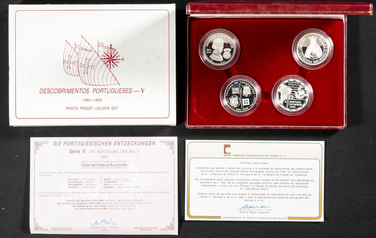 PORTUGAL. Serie Descubrimientos Portugueses V: La División del Mundo. 1994. Set oficial y completo compuesto por 4 monedas de 200 Escudos de plata. PROOF. Incluye certificado de autenticidad.