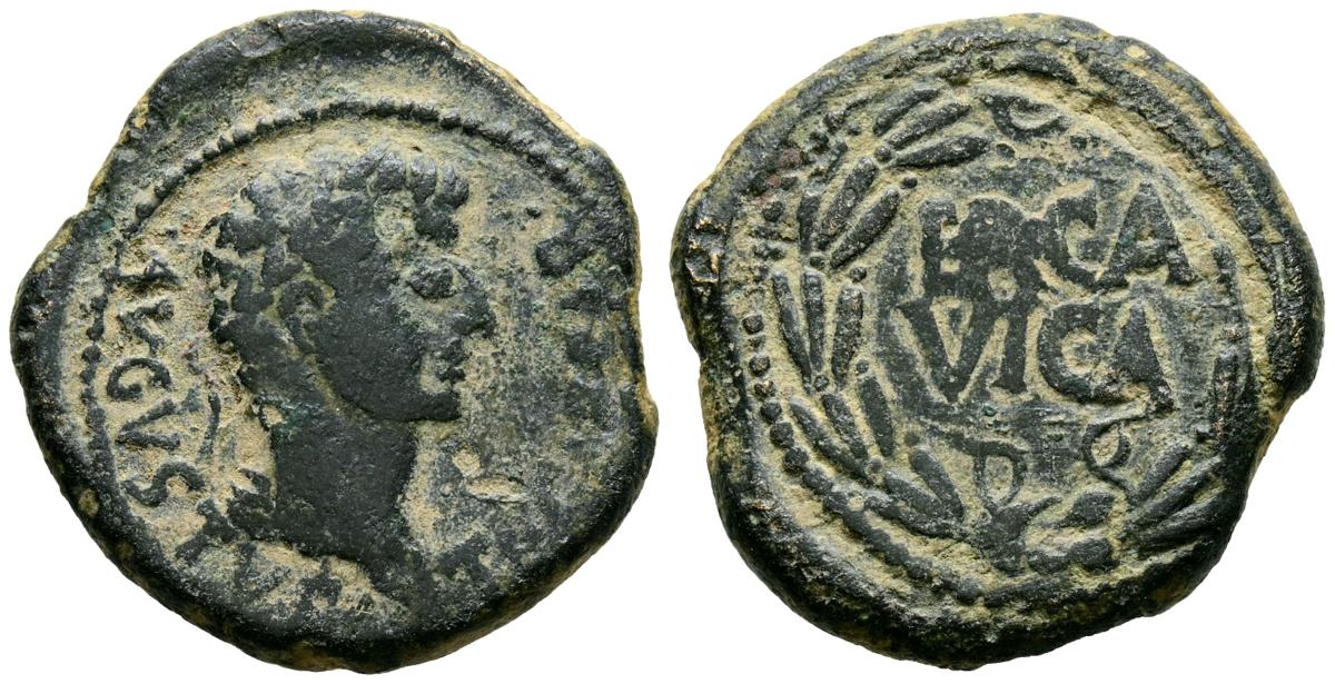ERCAVICA (Cañaveruelas, Cuenca). Semis. (Ae. 8,13g/23mm). 13-36 d.C. (FAB-1284). Anv: Cabeza de Tiberio a derecha, alrededor leyenda: TI CAESAR AVGVSTVS. Rev: Leyenda: ERCA/VICA, dentro de corona de laurel. MBC-.