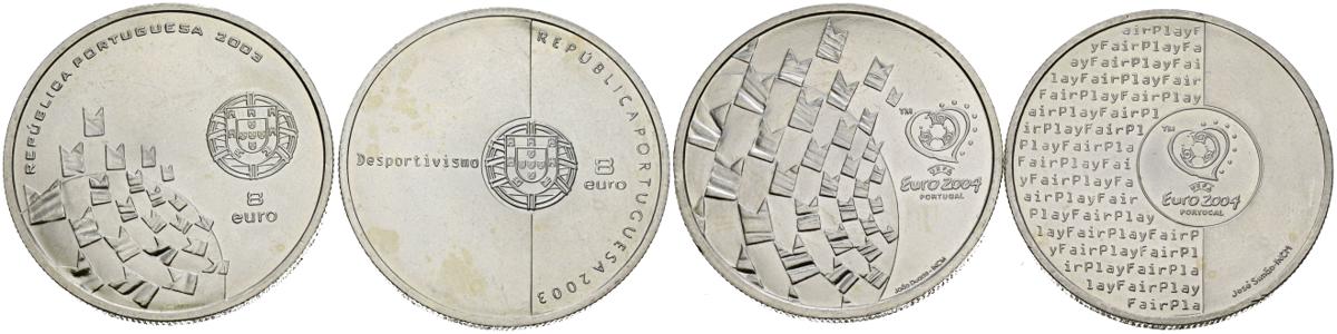 PORTUGAL. Conjunto de 2 monedas de 8 Euros en plata conmemorativos de la Eurocopa de Fútbol 2004. Acuñados en 2003. Alto nivel de conservación general. A EXAMINAR.