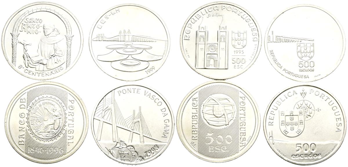 PORTUGAL. Conjunto de 4 monedas de 500 Escudos en plata, todas diferentes y acuñadas en 1995, 1996, 1998 y 1999. Alto nivel de conservación general. A EXAMINAR.