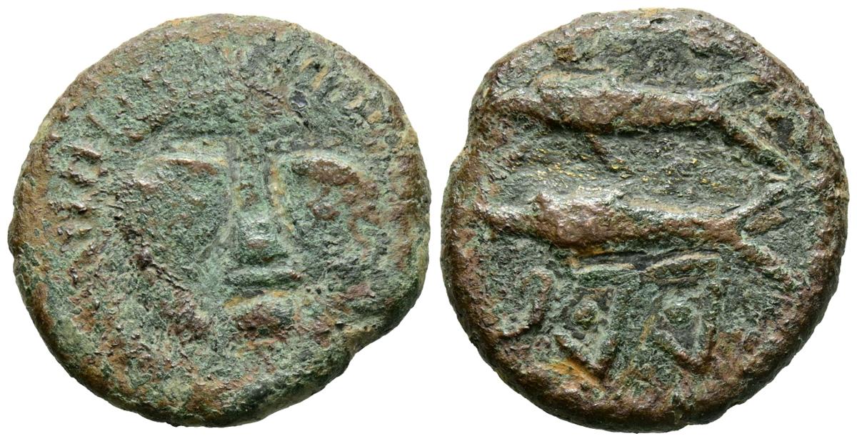 GADES (Cádiz). Calco. (Ae. 4,97g/19mm). 200-100 a.C. (FAB-1338). Anv: Cabeza de Melkart de frente con piel de león. Rev: Dos atunes a izquierda, entre ellos letra Alef, encima y debajo leyenda púnica tipo B. MBC-.
