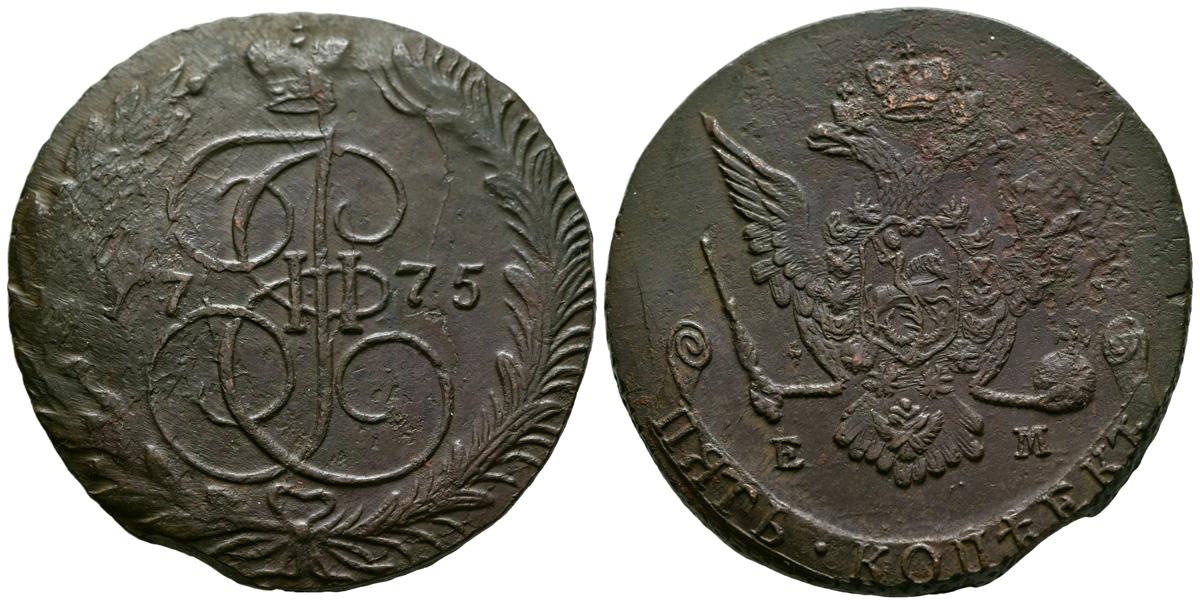 RUSIA. 5 Kopeks (Ae. 49,63g/42mm). 1775. Catalina II. Ekaterimburgo EM. (Km#59). MBC. Buen ejemplar.