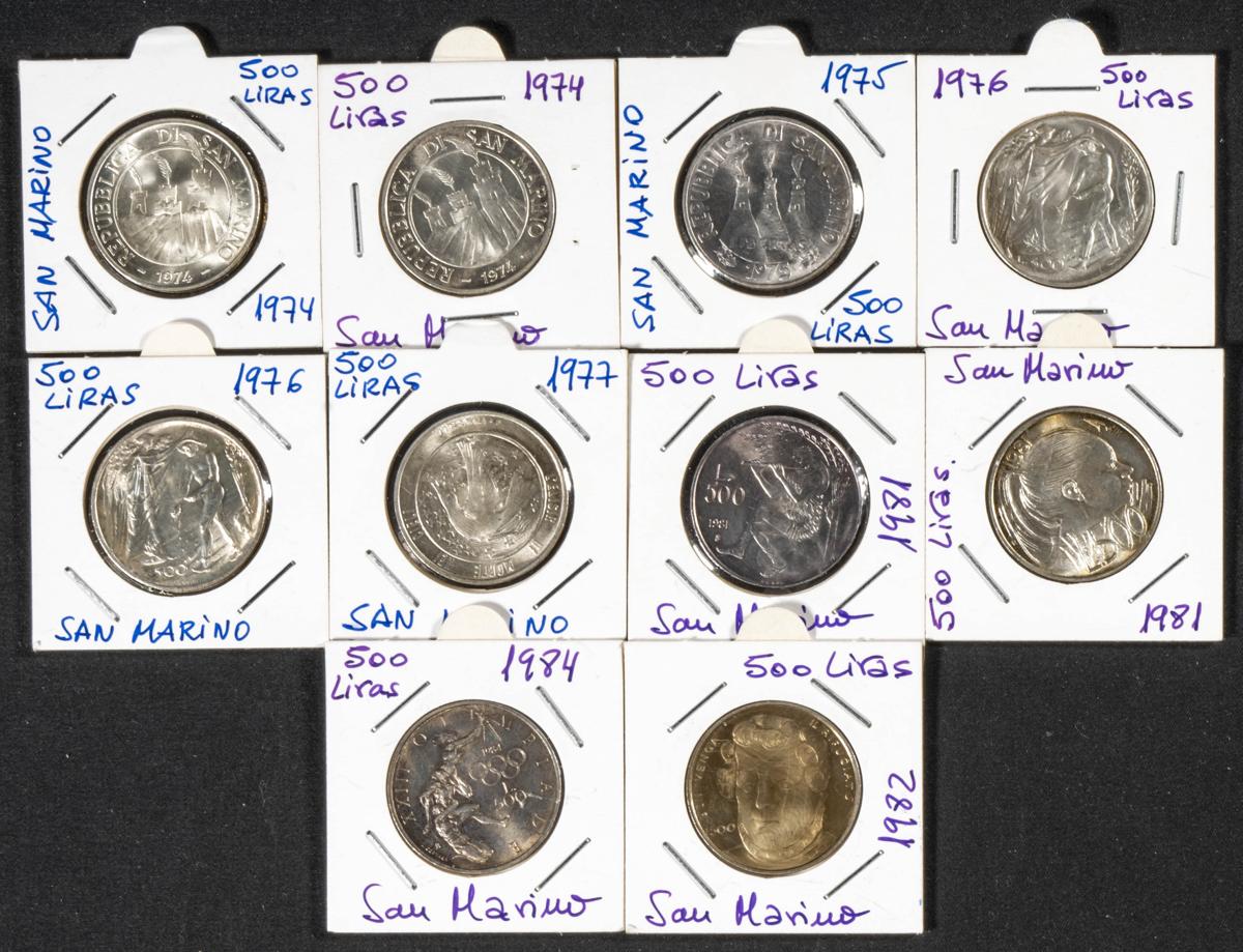 SAN MARINO. Interesante y variado conjunto de 10 monedas de 500 Liras de plata acuñadas entre 1974 y 1984. Solo un ejemplar repetido. Alto nivel de conservación general. A EXAMINAR.