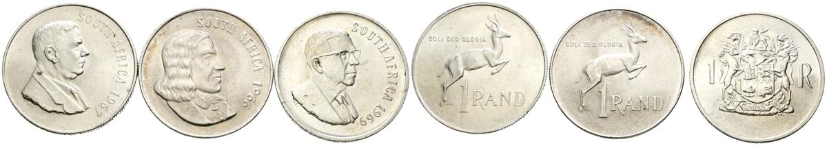 SUDÁFRICA. Precioso conjunto de 3 monedas de 1 Rand en plata acuñados en 1966, 1967 y 1969. Alto nivel de conservación general. A EXAMINAR.