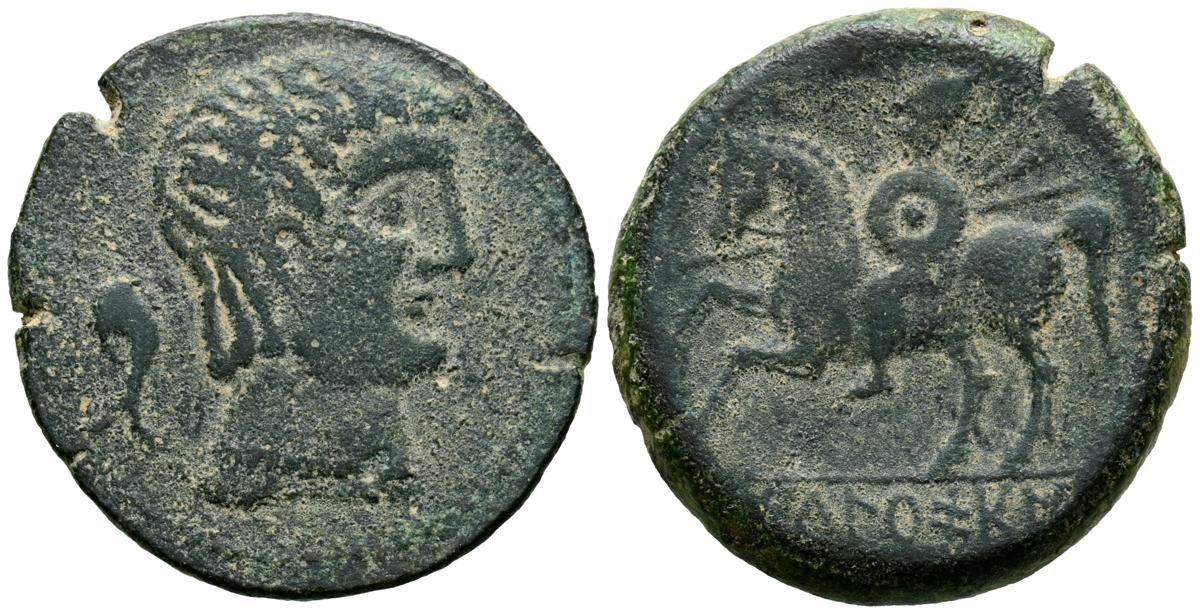 ICALCUNSCEN (Iniesta, Cuenca). As. (Ae. 8,23g/26mm). 120-20 a.C. (FAB-1412). Anv: Cabeza masculina a derecha, detrás delfín y delante estrella. Rev: Jinete con lanza y escudo, en exergo leyenda ibérica: ICaLCuNSCeN. MBC.