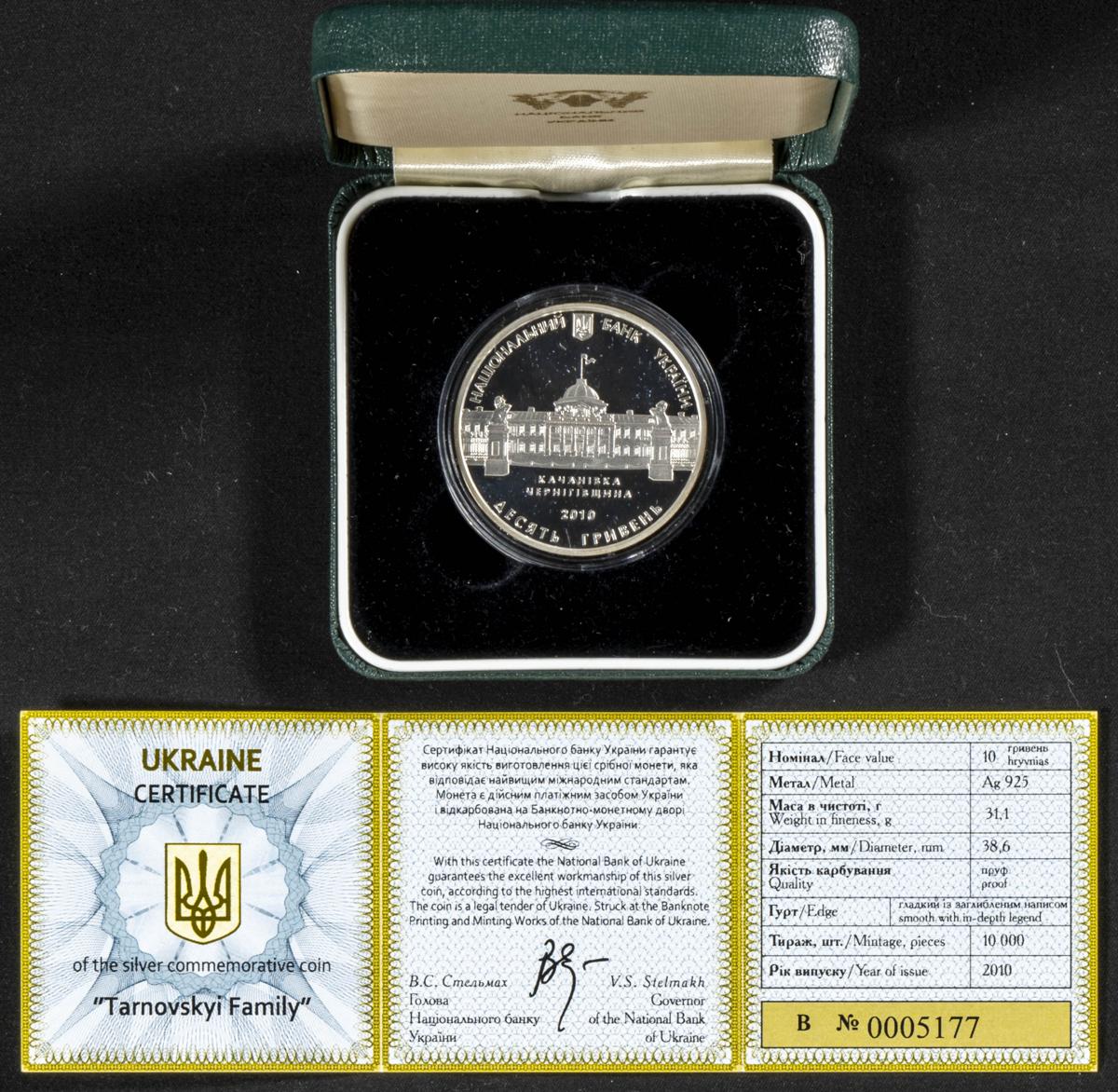 UCRANIA. 10 Hryvnias. (Ar. 31,10g/39mm). 2010. Conmemoración a la familia Tarnovskyi. PROOF. Incluye estuche y certificado oficial.