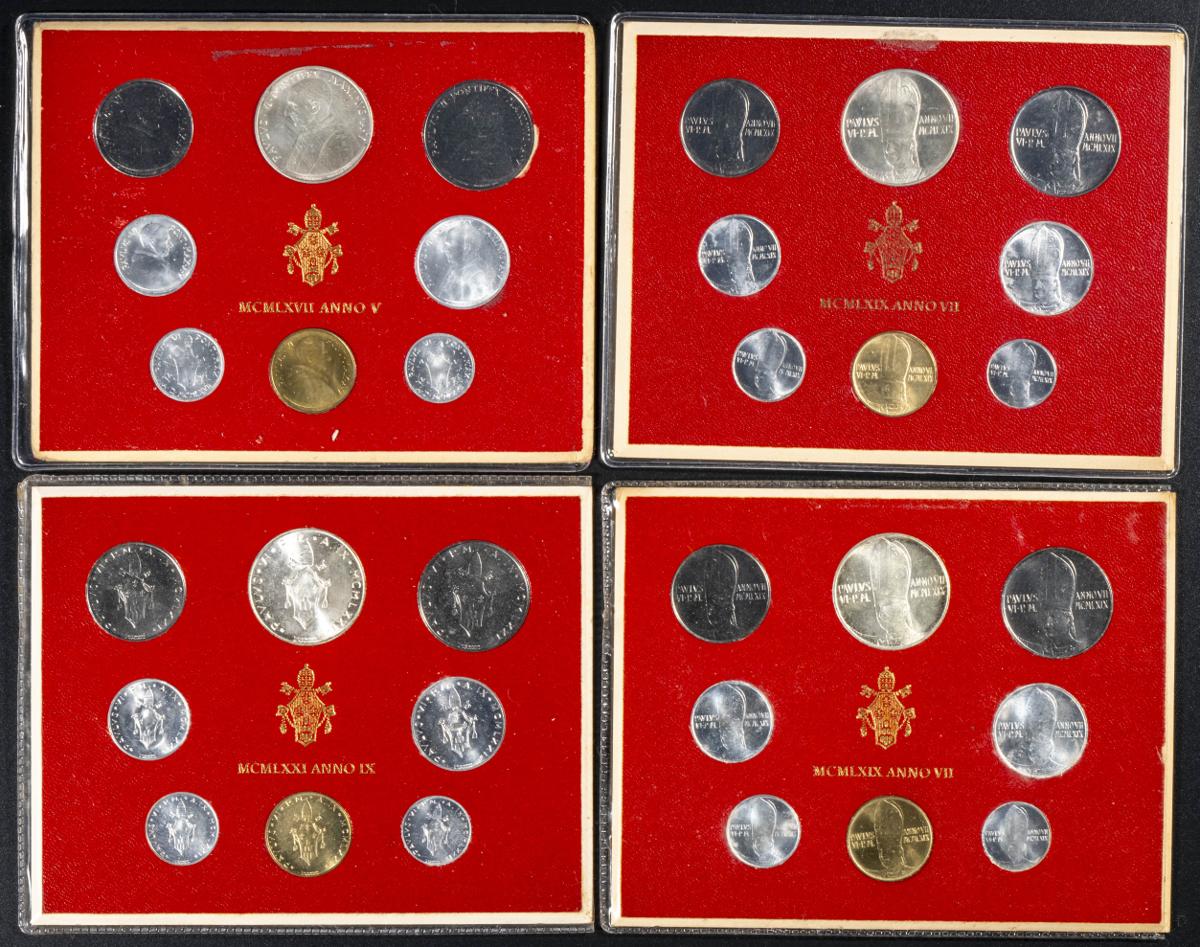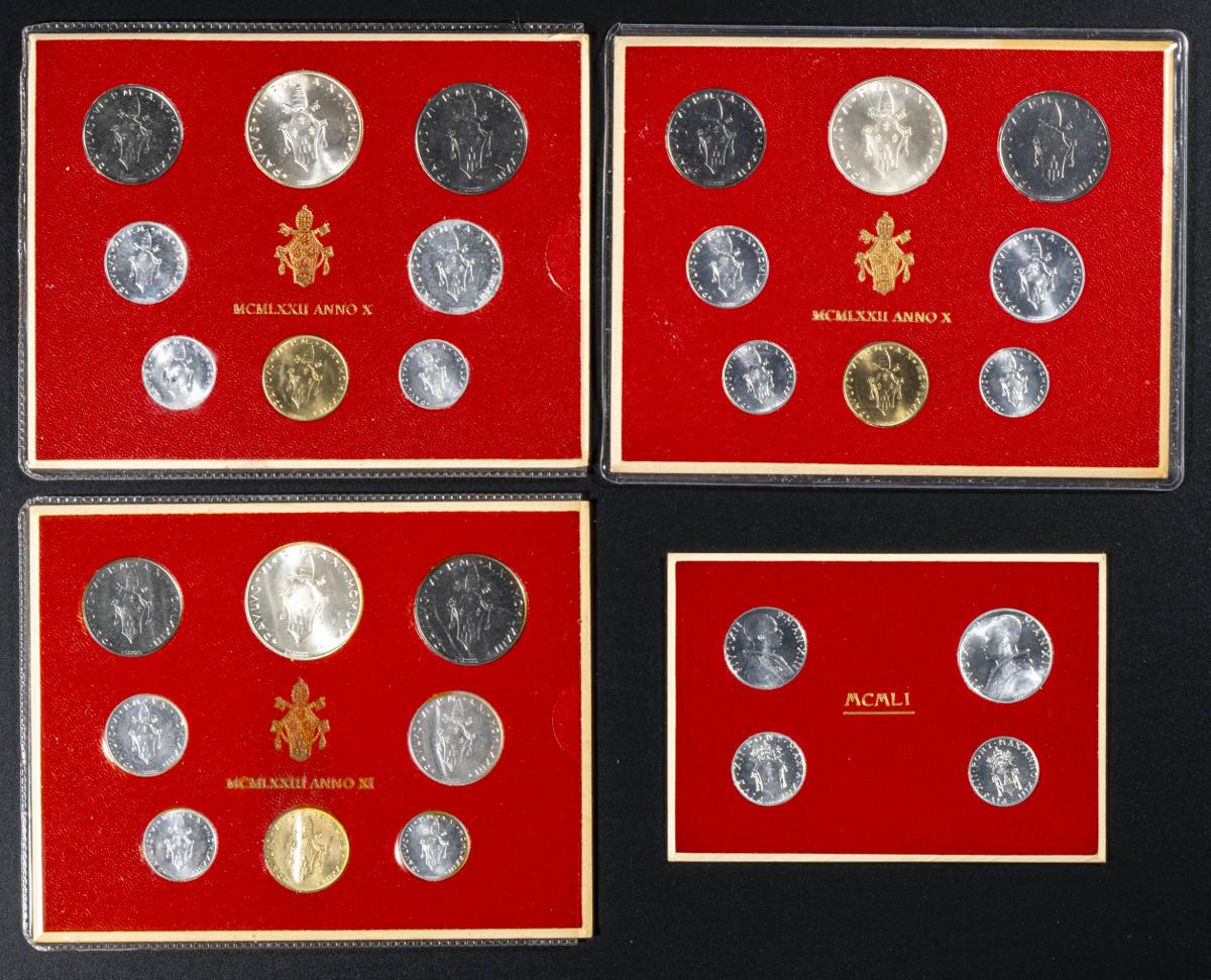 VATICANO. Conjunto de 8 carteras completas con fechas de 1951, 1968, 1969 (2), 1971, 1972 (2) y 1973. Módulos comprendido entre 1 y 500 Liras. Incluyes piezas en plata. SC.