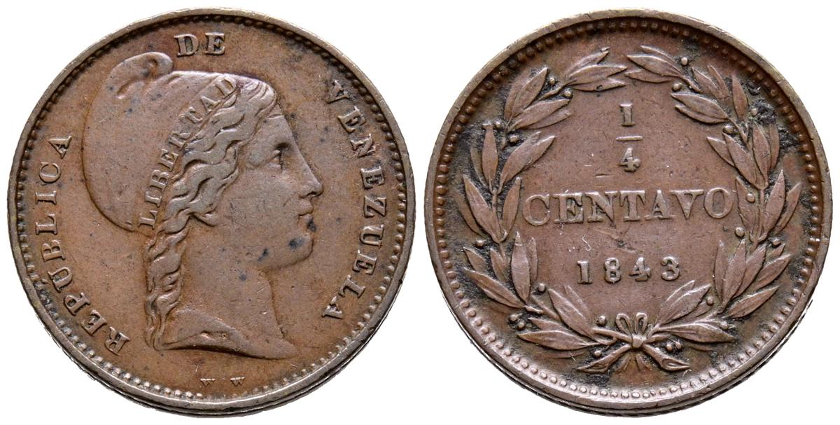 VENEZUELA. 1/4 Centavo. (Ae. 3,13g/19mm). 1843. Londres. WW debajo del busto. (Km#1). MBC.