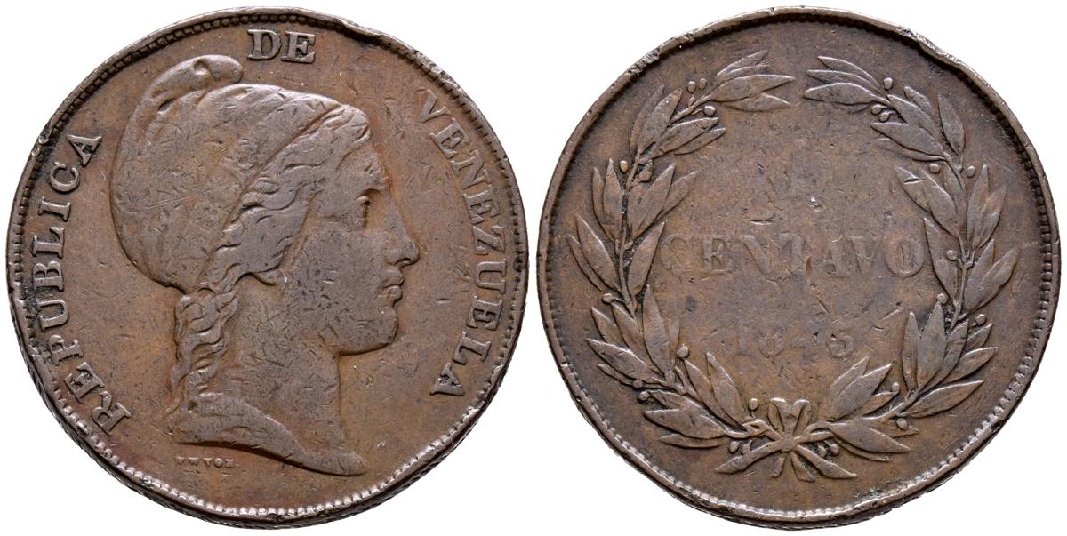 VENEZUELA. 1 Centavo. (Ae. 12,28g/32mm). 1843. Londres. (Km#3.1). BC+. Escasa.