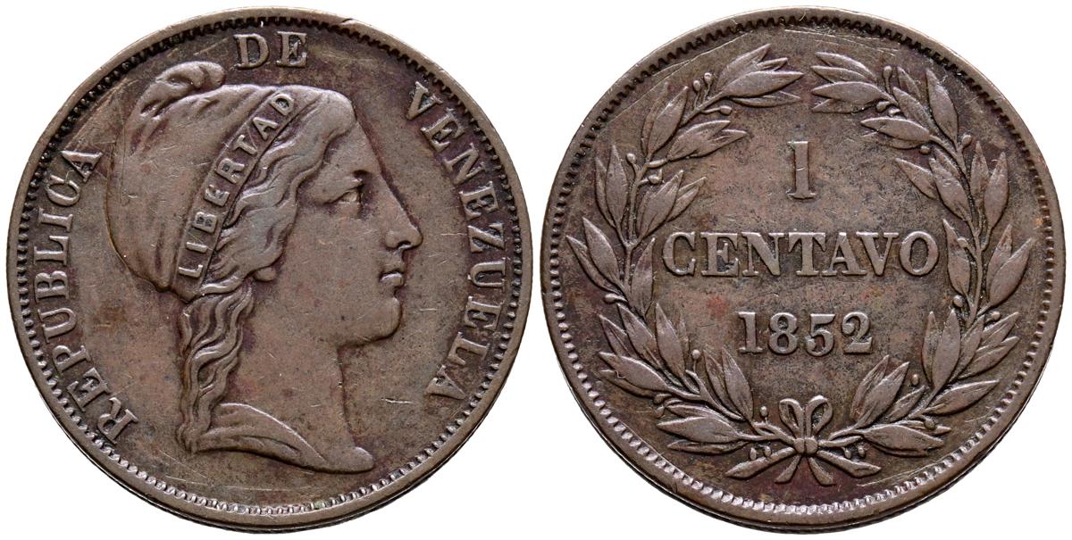 VENEZUELA. 1 Centavo. (Ae. 10,60/30mm). 1852. Londres. (Km#6). Sin H debajo del busto. MBC+.