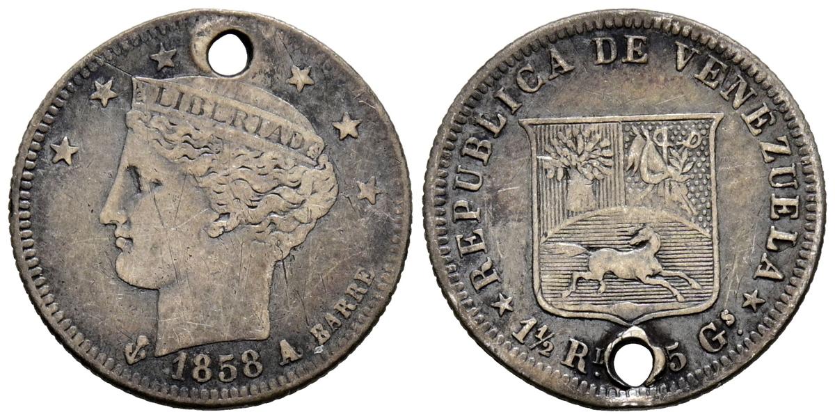 VENEZUELA. 1/2 Real. (Ar. 1,09g/16mm). 1858. París A. (Km#8). MBC-. Perforación. Escasa.