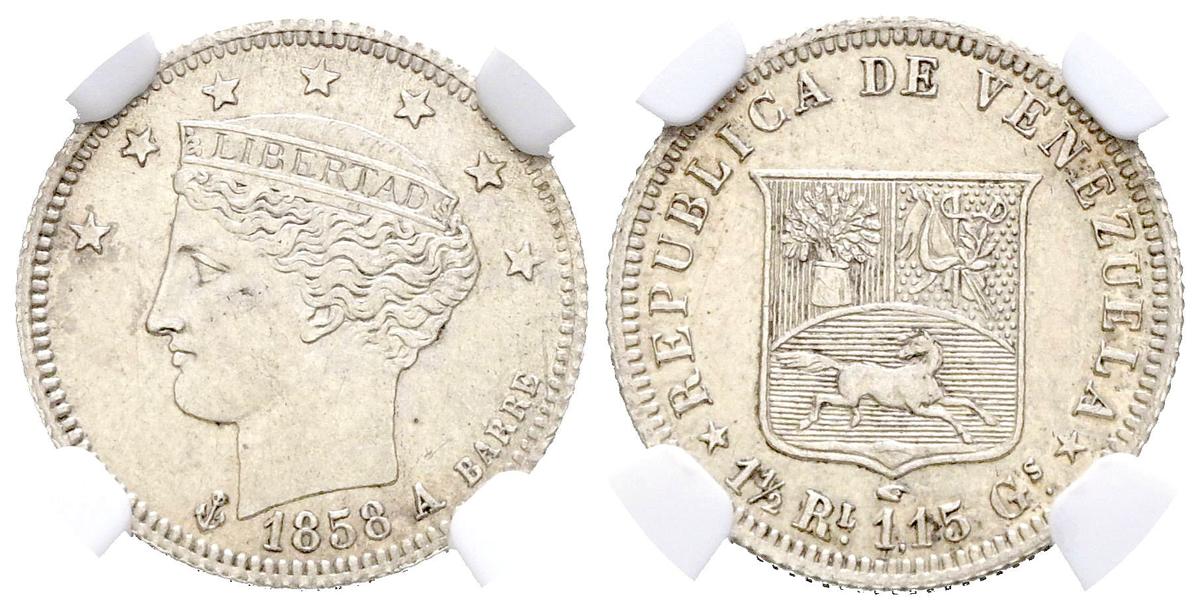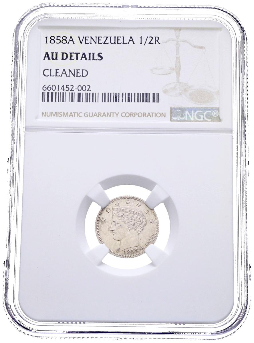 VENEZUELA. 1/2 Real. (Ar. 1,15g/16mm)*. 1858. París A. (Km#8). Encapsulada por NGC AU Details. Escasa. *Peso y medidas teóricos.