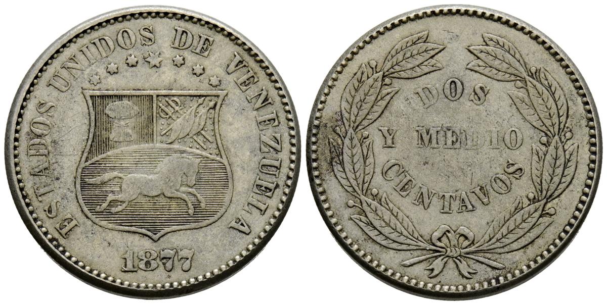 VENEZUELA. 2 1/2 Centavos (Cu-Ni. 4,87g/23mm). 1877. Philadelphia. (Km#26). MBC-.