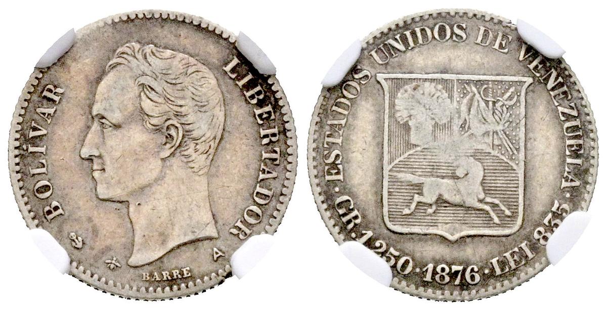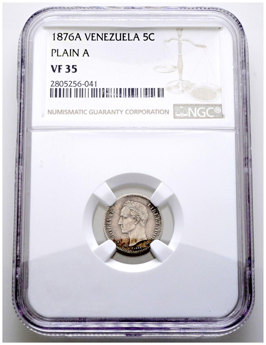 VENEZUELA. 5 Centavos. (Ar. 1,25g/16mm)*. 1876. París A. (Km#12.2). "Plain A" Encapsulado por NGC. VF 35. *Peso y medida teóricos.
