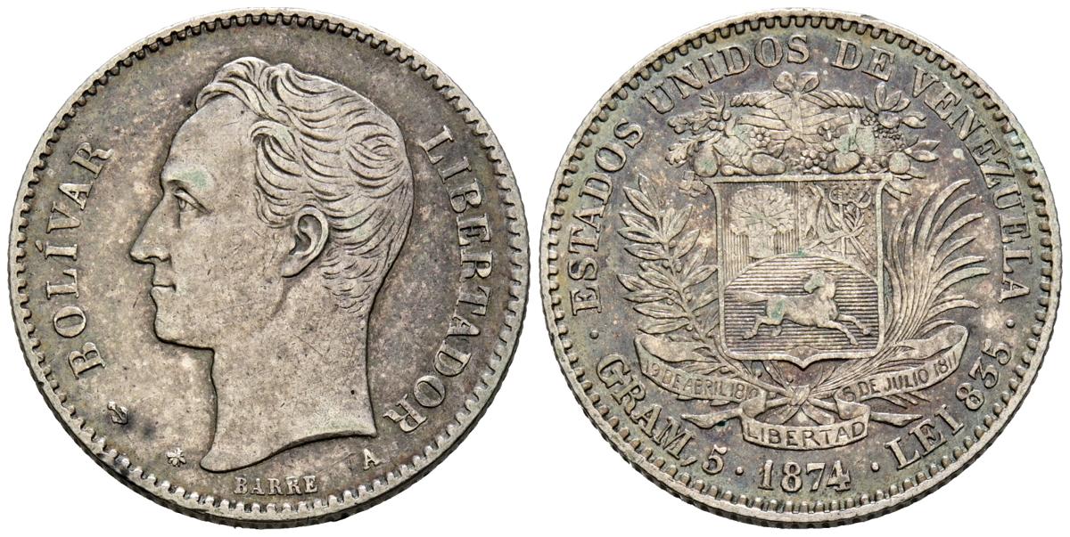 VENEZUELA. 20 Centavos. (Ar. 4,94g/24mm). 1874. París. (Km#14). MBC. Bonita pátina. Escasa.