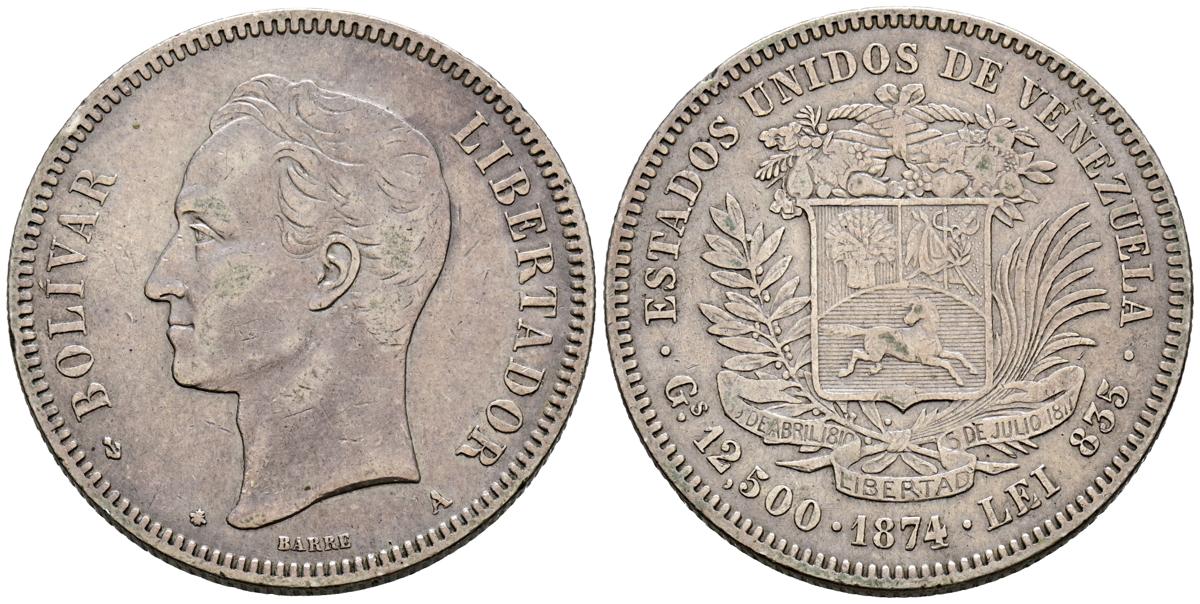 VENEZUELA. 50 Centavos. (Ar. 12,48g/30mm). 1874. París. (Km#15). MBC. Escasa.