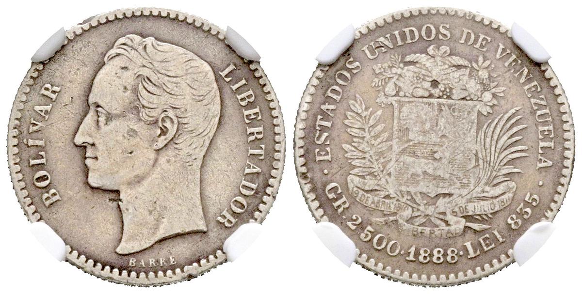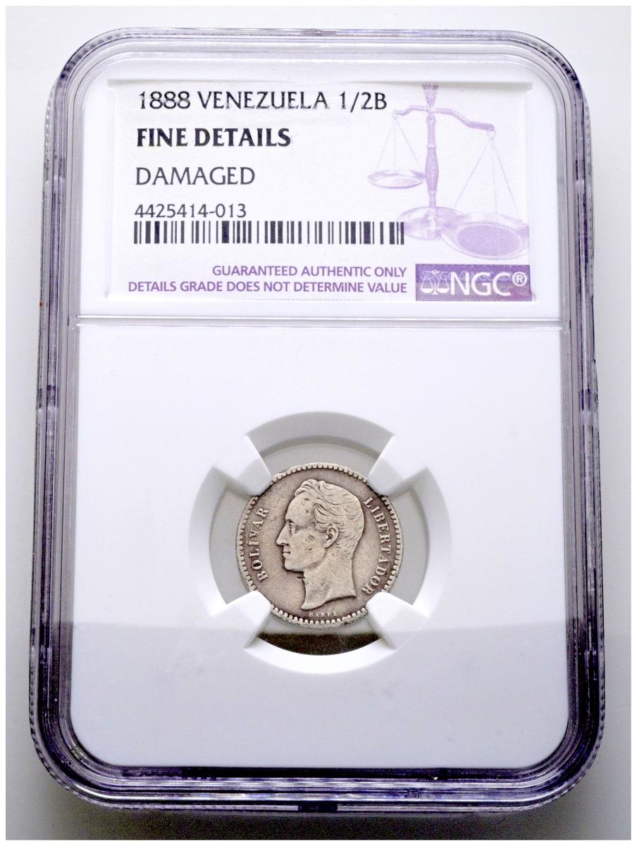 VENEZUELA. 1/2 Bolívar. (Ar. 2,50g/18mm)*. 1888. Caracas. (Km#21). Encapsulado por NGC Fine Details. Escasa. *Peso y medida teóricos.