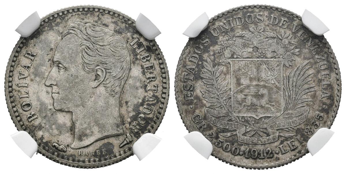 ESTADOS UNIDOS DE VENEZUELA. 1/2 Bolívar. (Ar. 2,50g/18mm). 1912. (Km#Y21). Encapsulado NGC XF-45.