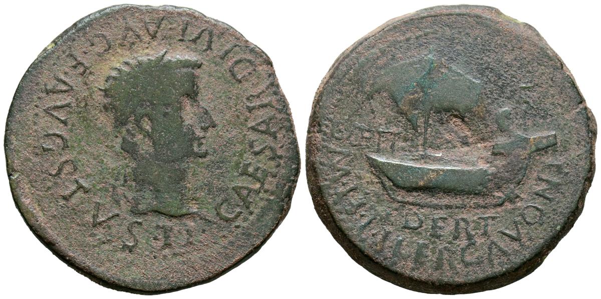 ILERGAVONIA (Tortosa, Tarragona). As. (Ae. 7,36g/25mm). 14-36 d.C. (FAB-1493). Anv: Cabeza laureada de Tiberio a derecha, alrededor leyenda: TI CAESAR DIVI AVG AVGVSTVS. Rev: Nave, debajo: DERT/ILRECAVONIA. BC+. Escaso ejemplar.