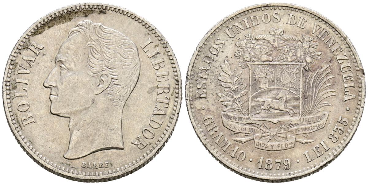 VENEZUELA. 2 Bolívares (Ar. 9,84g/27mm). 1879. Bruselas. (Km#23). MBC+. Escasa.