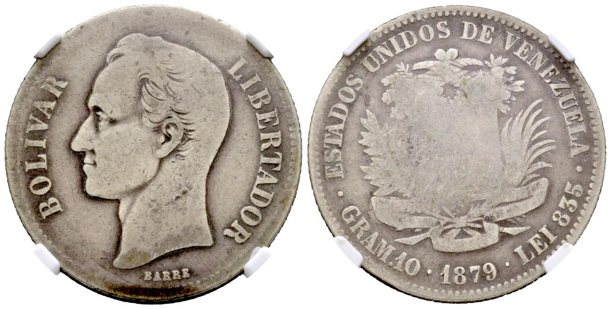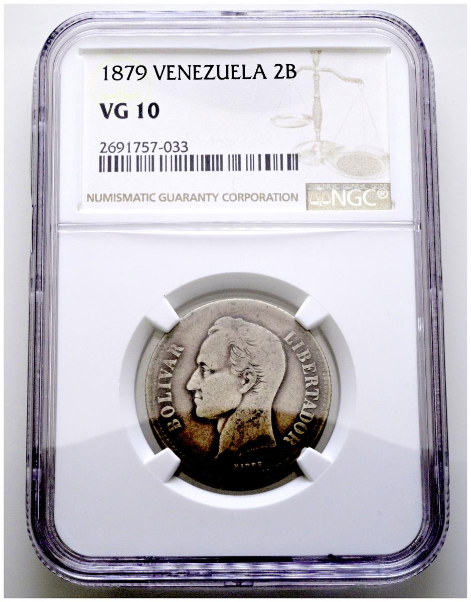 VENEZUELA. 2 Bolívares. (Ar. 10,00g/27mm)*. 1879. Bruselas. (Km#23). Encapsulado por NGC VG 10. *Peso y medida teóricos.