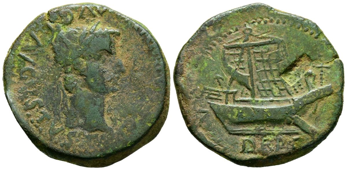 ILERGAVONIA (Tortosa, Tarragona). As. (Ae. 7,35g/23mm). 14-36 d.C. (FAB-1493). Anv: Cabeza laureada de Tiberio a derecha, alrededor leyenda: TI CAESAR DIVI AVG AVGVSTVS. Rev: Nave, debajo: DERT/ILRECAVONIA. BC+/MBC. Resello en reverso.