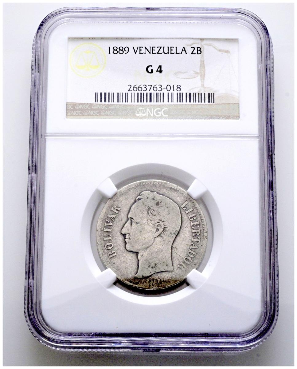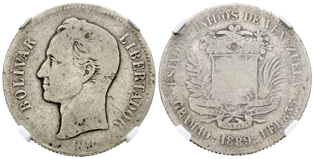 VENEZUELA. 2 Bolívares. (Ar. 10,00g/27mm)*. 1889. Caracas. (Km#23). Encapsulado por NGC G 4. *Peso y medidas teórico.