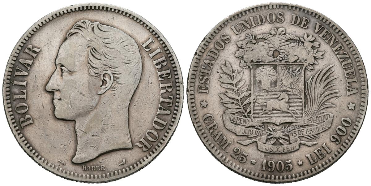 ESTADOS UNIDOS DE VENEZUELA. 5 Bolívares. (Ar. 24,65g/37mm). 1905. (Km#Y24.2). MBC.