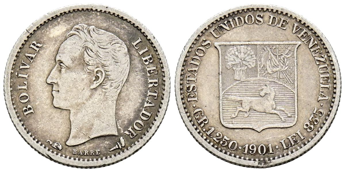 VENEZUELA. 25 Céntimos (Ar. 1,25g/16mm). 1901. París. (KM#20). MBC. Fecha más rara de la serie.